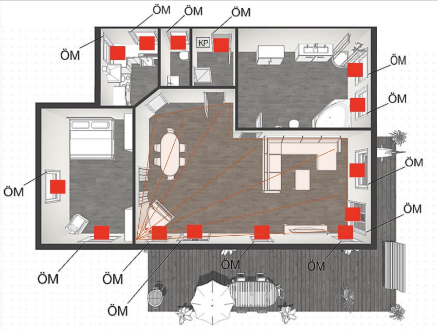 Es werden je Stockwerk mind. ein Bewegungsmelder angebracht und zusätzlich werden in den Räumen mit Glasflächen Glasbruchmelder angebracht.